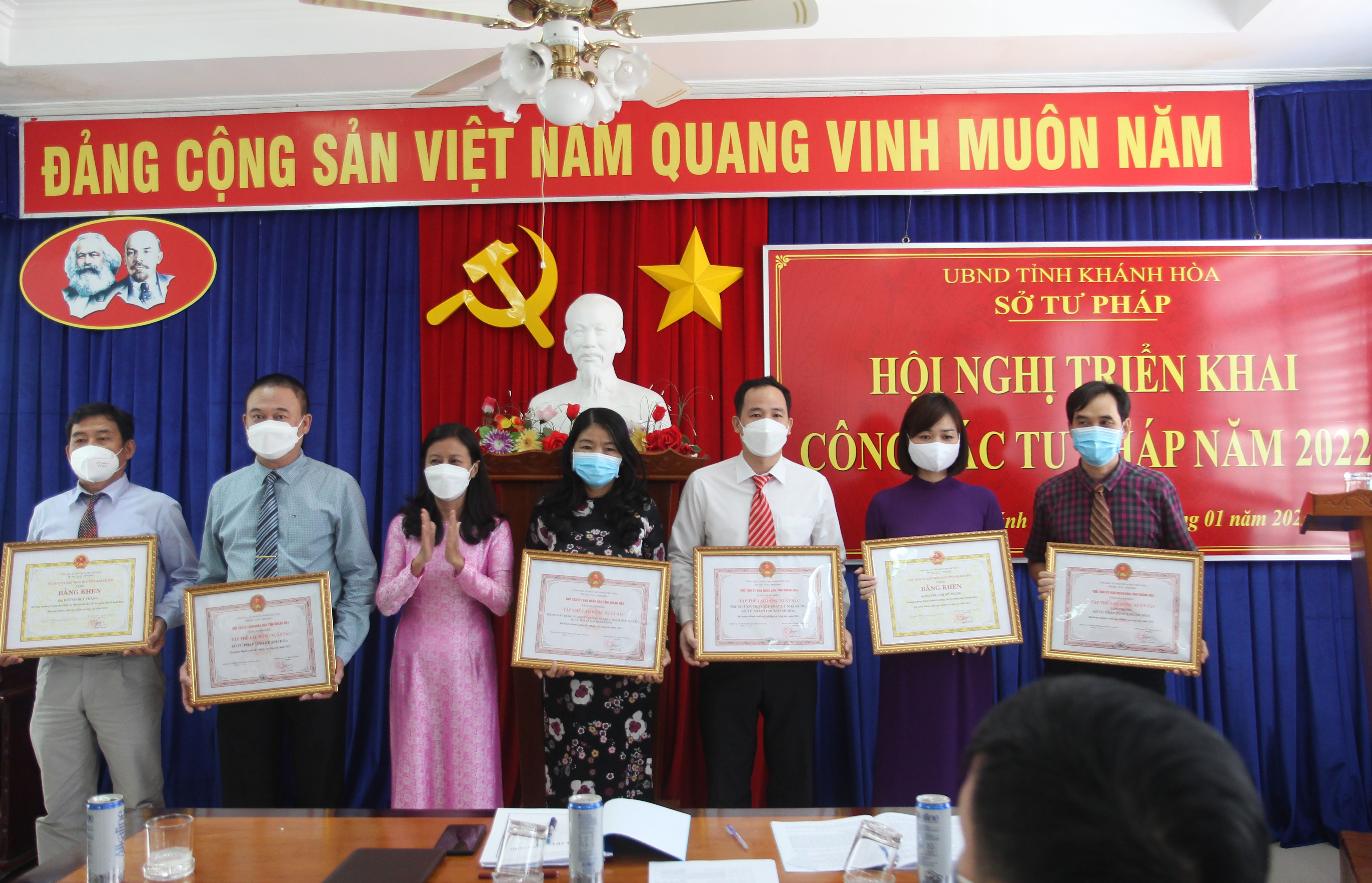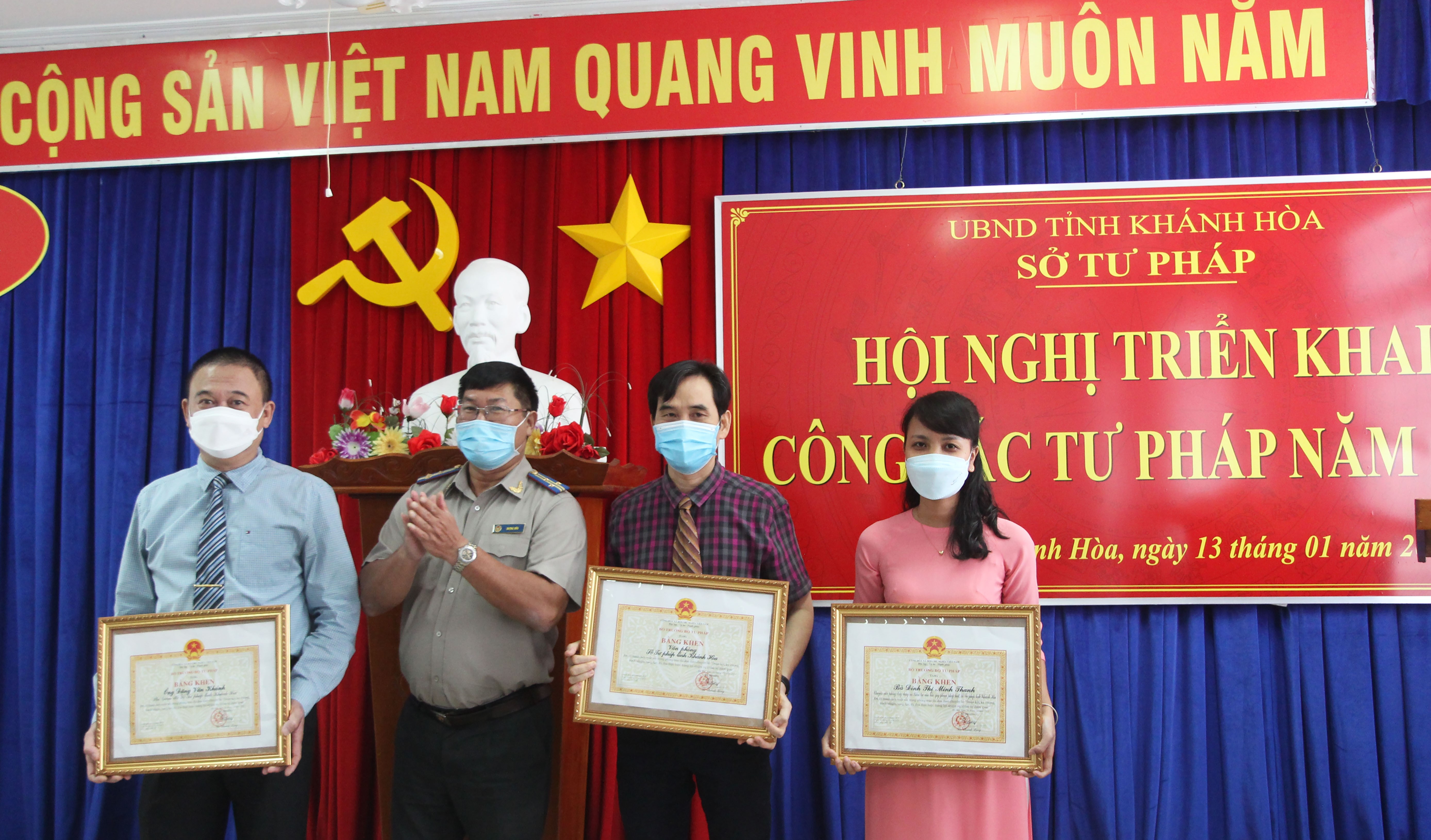 Với những kết quả nổi bật đã đạt trong năm 2021, Sở Tư pháp đã vinh dự được Bộ Tư pháp tặng Cờ thi đua ngành Tư pháp năm 2021, 01 tập thể và 02 cá nhân có thành tích xuất sắc được nhận bằng khen của Bộ trưởng Bộ Tư pháp, 10 cá nhân trong tỉnh được tặng kỷ niệm chương “Vì sự nghiệp tư pháp”. Nhân dịp này, UBND tỉnh tặng cờ thi đua cho Trung tâm Trợ giúp pháp lý Nhà nước tỉnh; tặng danh hiệu Tập thể lao động xuất sắc cho 4 tập thể và bằng khen cho 01 tập thể và 02 cá nhân có thành tích xuất sắc trong công tác.