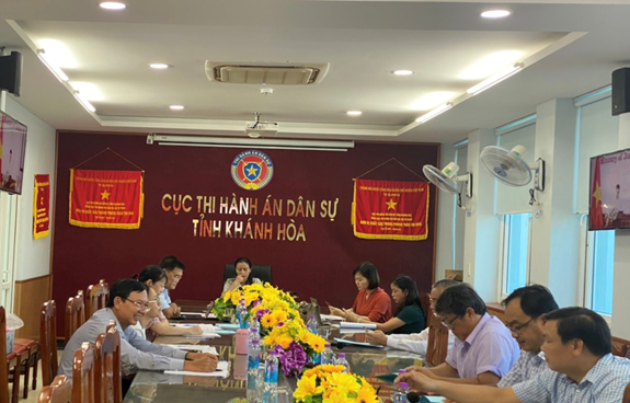 Đồng chí Nguyễn Thị Lan Phương – Giám đốc Sở Tư pháp Khánh Hòa chủ trì Hội nghị tại điểm cầu Khánh Hòa (tại phòng họp trực tuyến Cục Thi hành án dân sự tỉnh).