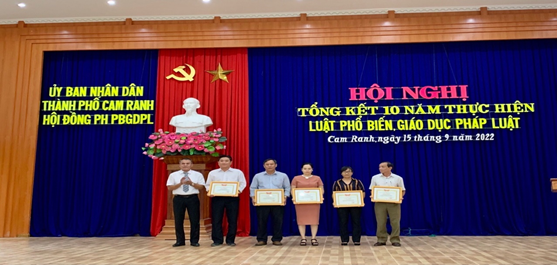 Tại hội nghị, đã trao tặng Giấy khen Chủ tịch UBND thành phố Cam Ranh cho 05 tập thể và 08 cá nhân đã có thành tích tiêu biểu trong 10 năm thực hiện Luật Phổ biến giáo dục pháp luật.