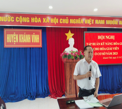 Thực hiện Kế hoạch số 3192/KH-UBND ngày 27 tháng 10 năm 2023 của Ủy ban nhân dân huyện Khánh Vĩnh về tổ chức Hội nghị tập huấn kỹ năng hòa giải cho hòa giải viên ở cơ sở năm 2023 trên địa bàn huyện. Ngày 31 tháng 10 năm 2023, tại Hội trường Ủy ban nhân dân huyện, Phòng Tư pháp tổ chức Hội nghị tập huấn nghiệp vụ hòa giải ở cơ sở cho 90 đại biểu là Hòa giải viên các Tổ hòa giải trên địa bàn huyện.