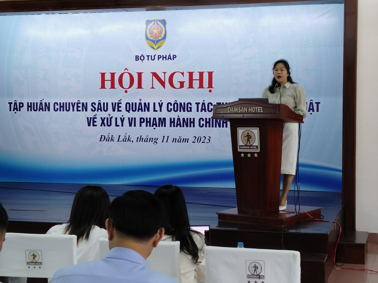 Ngày 08/11/2023, tại thành phố Buôn Ma Thuột (tỉnh Đăk Lăk), Cục Quản lý xử lý vi phạm hành chính (XLVPHC) và theo dõi thi hành pháp luật (TDTHPL), Bộ Tư pháp tổ chức "Hội nghị tập huấn chuyên sâu quản lý công tác thi hành pháp luật về xử lý vi phạm hành chính" cho hơn 100 đại biểu của Công an tỉnh, các sở, ban ngành, UBND cấp huyện trên địa bàn 3 tỉnh Đăk Lăk, Đăk Nông và Khánh Hòa. Đồng chí Nguyễn Thanh Hà - Phó Cục trưởng Cục QLXLVPHC & TDTHPL chủ trì hội nghị.