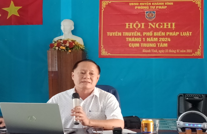 Thực hiện Chỉ thị số 16/CT-UBND ngày 29/12/2023 của UBND tỉnh Khánh Hòa về việc tổ chức Tết Giáp Thìn năm 2024 trên địa bàn tỉnh và Chỉ thị số 26-CT/HU ngày 22/12/2023 của Ban Thường vụ Huyện ủy Khánh Vĩnh về việc tổ chức Tết Giáp Thìn năm 2024 trên địa bàn huyện. Nhằm góp phần chuẩn bị tốt các điều kiện phục vụ Nhân dân đón Tết Nguyên đán Giáp Thìn năm 2024 vui tươi, lành mạnh, an toàn, tiết kiệm. Từ ngày 23 đến ngày 25 tháng 01 năm 2024, Hội đồng Phối hợp phổ biến giáo dục pháp luật huyện Khánh Vĩnh tổ chức 03 Hội nghị tuyên truyền, phổ biến pháp luật cho 150 đại biểu là Già làng, Trưởng thôn, Tổ trưởng Tổ Hòa giải, Hòa giải viên, Tuyên truyền viên pháp luật và Nhân dân trên địa bàn huyện.