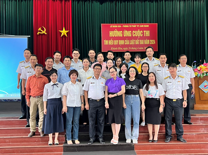 Nhằm đổi mới hình thức tuyên truyền Cuộc thi "Tìm hiểu quy định của Luật Đất đai năm 2024", chiều ngày 26/4/2024 phòng Tư pháp thành phố Cam Ranh phối hợp cùng công chức tư pháp - hộ tịch 15 xã, phường trên địa bàn thành phố đã tổ chức hướng dẫn trực tiếp hơn 180 cán bộ chiến sỹ Lữ đoàn 954 - Quân chủng Hải quân hưởng ứng tham gia Cuộc thi nêu trên. Trước đó, nhằm nâng cao chất lượng, điểm số tuyệt đối, là động lực để cán bộ công chức, Nhân dân hưởng ứng cuộc thi, phòng Tư pháp đã biên tập đáp án Bộ câu hỏi của Cuộc thi gồm 50 câu gửi đến các tổ chức, đoàn thể, Nhân dân, các đơn vị bộ đội đóng quân trên địa bàn thành phố.