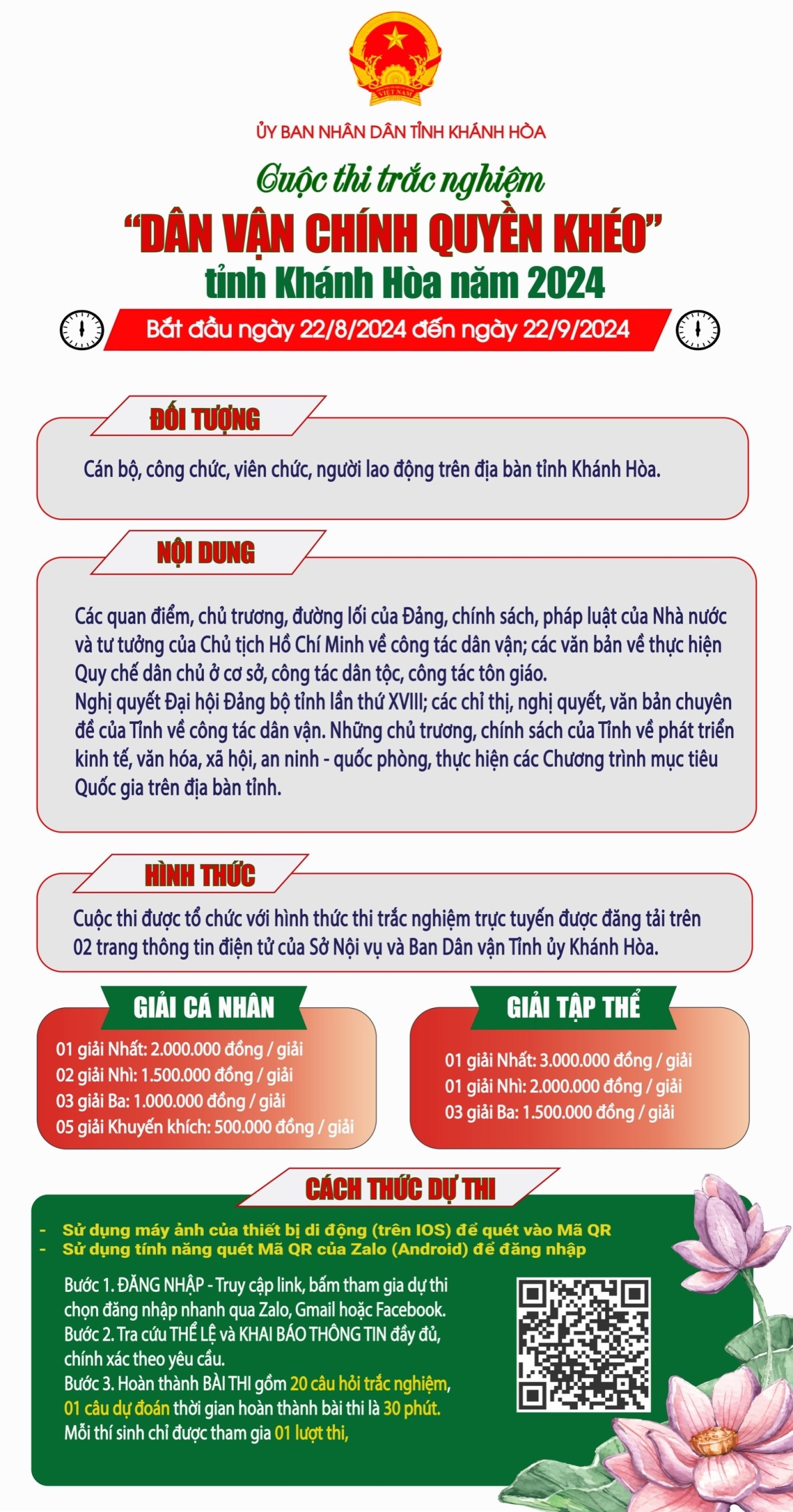 Cuộc thi trắc nghiệm “Dân vận chính quyền khéo” tỉnh Khánh Hòa năm 2024 được tổ chức theo hình thức trắc nghiệm trên mạng Internet. Thông tin về cuộc thi được đăng tải trên Trang Thông tin điện tử Sở Nội vụ và Ban Dân vận Tỉnh ủy Khánh Hòa.