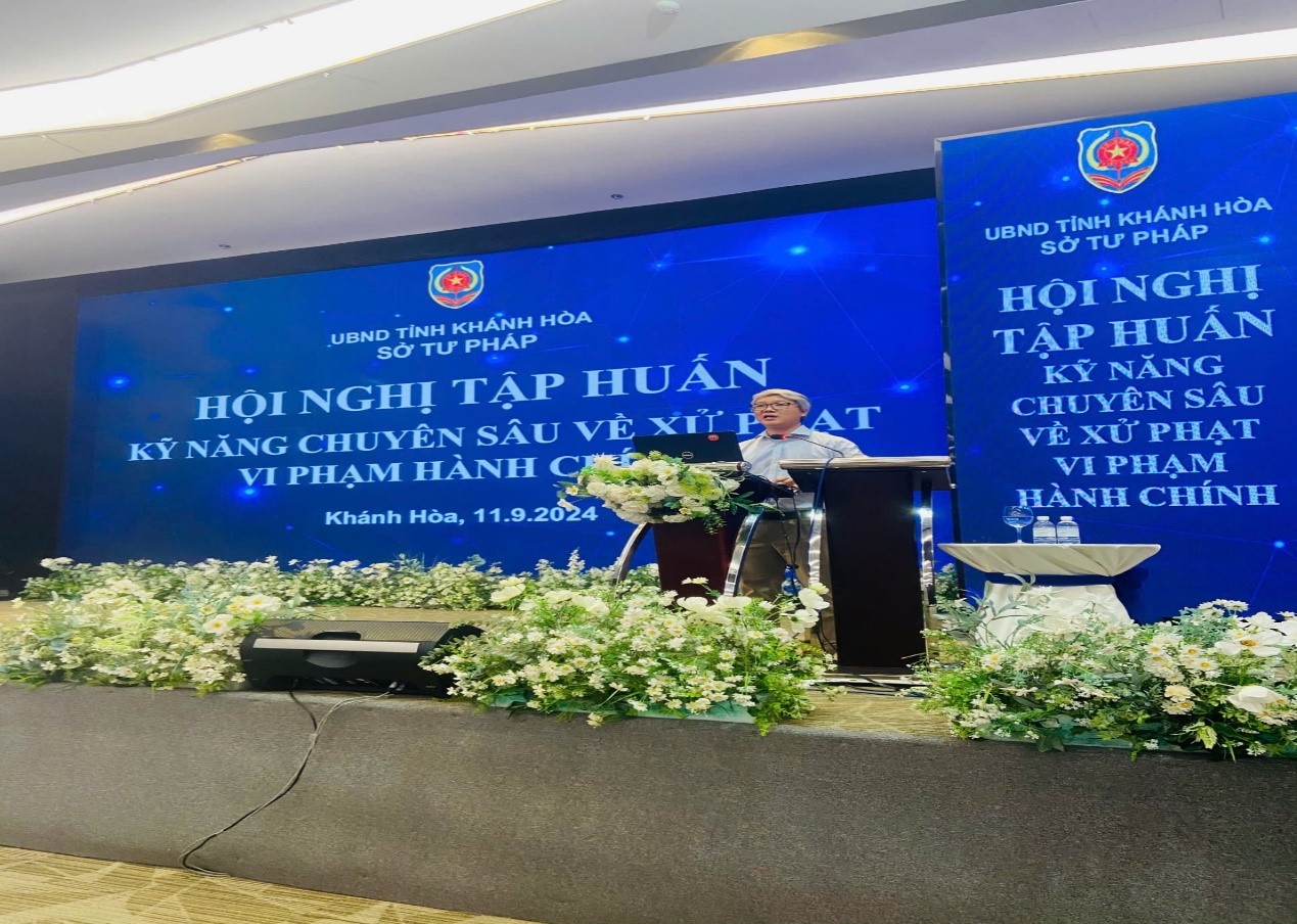 Ngày 11/9/2024, Sở Tư pháp tỉnh Khánh Hòa tổ chức Hội nghị tập huấn kỹ năng chuyên sâu về xử phạt vi phạm hành chính năm 2024 trên địa bàn tỉnh. Thạc sĩ luật Nguyễn Hoàng Việt – Báo cáo viên có nhiều kinh nghiệm trong lĩnh vực xử lý vi phạm hành chính, Cục Quản lý xử lý vi phạm hành chính và theo dõi thi hành pháp luật - Bộ Tư pháp trực tiếp báo cáo tại hội nghị.