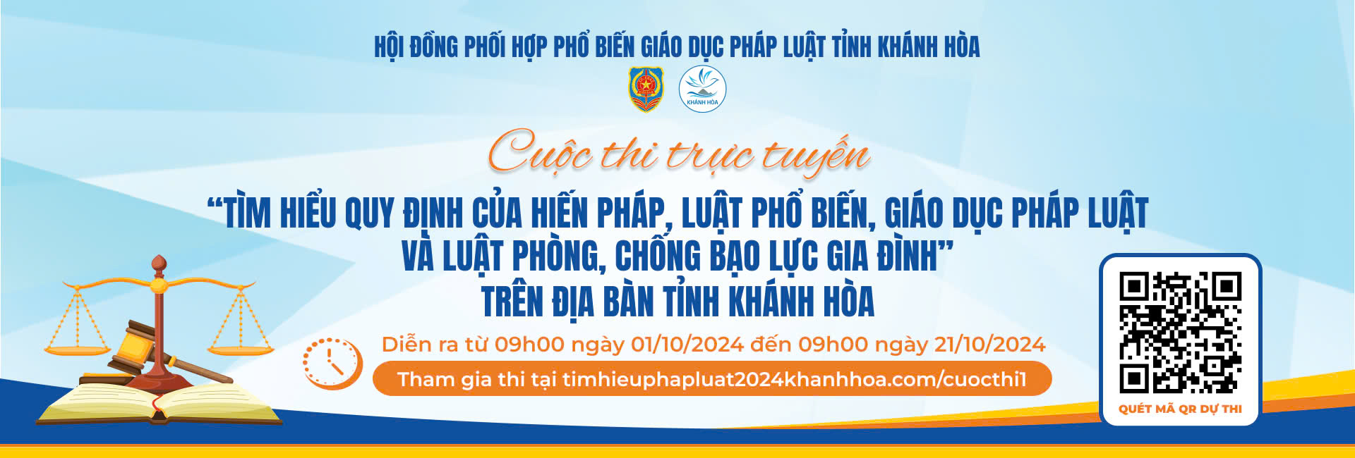 1. Cuộc thi trực tuyến “Tìm hiểu quy định của Hiến pháp, Luật Phổ biến, giáo dục pháp luật và Luật Phòng, chống bạo lực gia đình” trên địa bàn tỉnh Khánh Hòa bắt đầu vào lúc 09 giờ 00 phút ngày 01/10/2024, kết thúc vào lúc 09 giờ 00 phút ngày 21/10/2024.