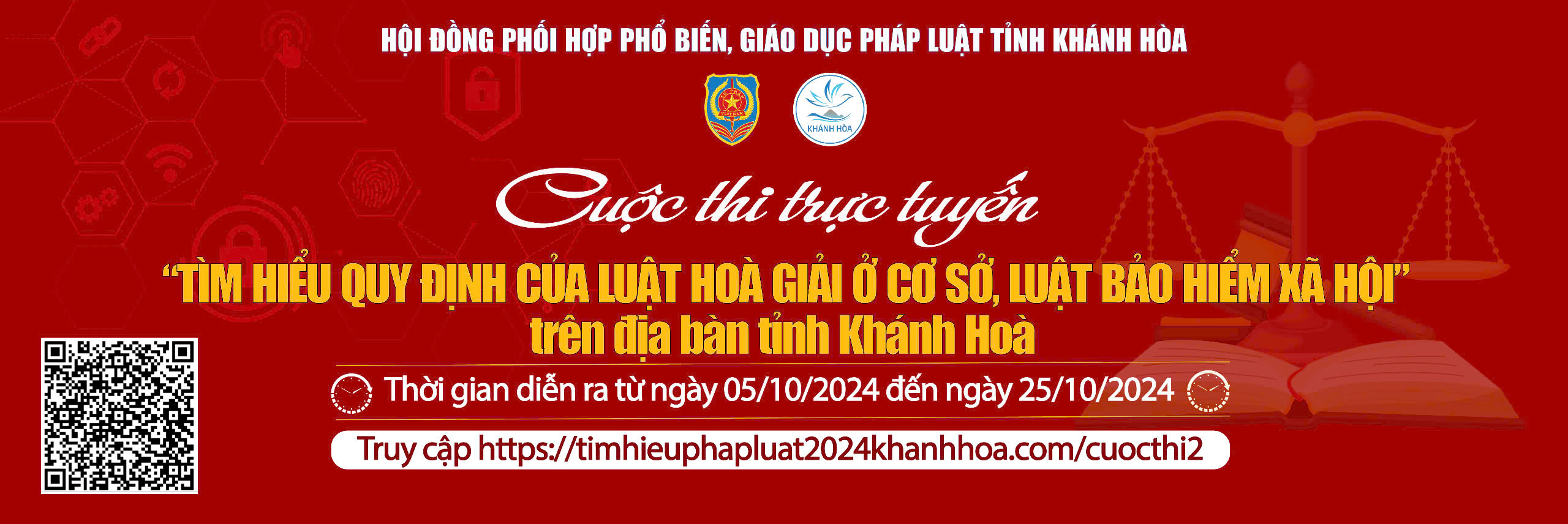 2. Cuộc thi trực tuyến “Tìm hiểu quy định của Luật Hòa giải ở cơ sở, Luật Bảo hiểm xã hội” trên địa bàn tỉnh Khánh Hòa bắt đầu vào lúc 09 giờ 00 phút ngày 05/10/2024, kết thúc vào lúc 09 giờ 00 phút 25/10/2024.
