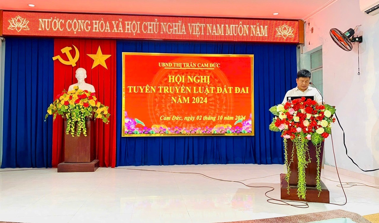 Sáng ngày 02 tháng 10 năm 2024, UBND thị trấn Cam Đức, huyện Cam Lâm tổ chức Hội nghị tuyên truyền Luật Đất đai năm 2024 cho gần 100 đại biểu là lãnh đạo Đảng ủy, HĐND, UBND, cán bộ, công chức các ban, ngành, đoàn thể ở thị trấn, Tổ trưởng Tổ dân phố, Bí thư Chi bộ và các Tổ hòa giải cơ sở trên địa bàn thị trấn.