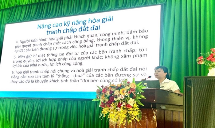 Trong khuôn khổ Hội nghị, các đại biểu cũng được nghe bà Nguyễn Thị Mai Thanh Ngọc –Trưởng phòng Tư pháp, báo cáo viên pháp luật thành phố trao đổi, giải đáp một số vướng mắc trong hoạt động hòa giải ở cơ sở, xử lý tình huống phát sinh liên quan lĩnh vực đất đai, xây dựng và bảo vệ môi trường…