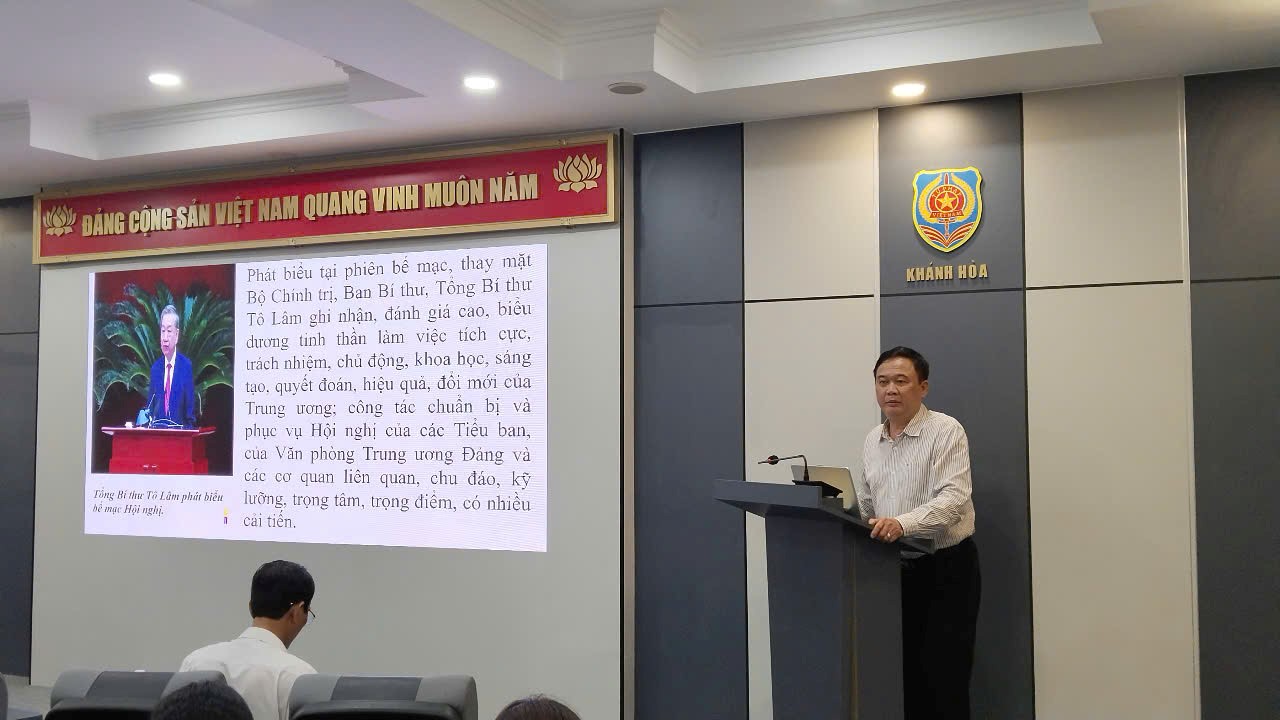 Tại hội nghị, đồng chí Đặng Văn Khánh –Phó Giám đốc Sở Tư pháp đã báo cáo nhanh kết quả Hội nghị lần thứ 11 Ban Chấp hành Trung ương Đảng khóa XIII, tập trung vào các nội dung như: Trung ương thống nhất thông qua nội dung cơ bản các dự thảo văn kiện Đại hội XIV, nhiệm kỳ 2026-2031; dự thảo phương hướng công tác nhân sự Ban Chấp hành Trung ương Đảng khóa XIV; đề án phương hướng bầu cử đại biểu Quốc hội khóa XVI và đại biểu HĐND các cấp nhiệm kỳ 2026-2031; Đề án về phương án sáp nhập đơn vị hành chính cấp tỉnh, không tổ chức cấp huyện, sáp nhập cấp xã và xây dựng mô hình tổ chức chính quyền địa phương 2 cấp; sắp xếp các tổ chức chính trị - xã hội, các hội quần chúng được Đảng và Nhà nước giao nhiệm vụ vào Mặt trận Tổ quốc Việt Nam; sắp xếp, tinh gọn tổ chức bộ máy Tòa án nhân dân, Viện kiểm sát nhân dân; xây dựng hệ thống tổ chức đảng ở địa phương; chủ trương sửa đổi, bổ sung một số điều của Hiến pháp năm 2013…Bên cạnh đó, đồng chí Đặng Văn Khánh cũng đã thông tin những nội dung về phương án không tổ chức cấp huyện, sắp xếp đơn vị hành chính cấp xã trên địa bàn tỉnh Khánh Hòa.