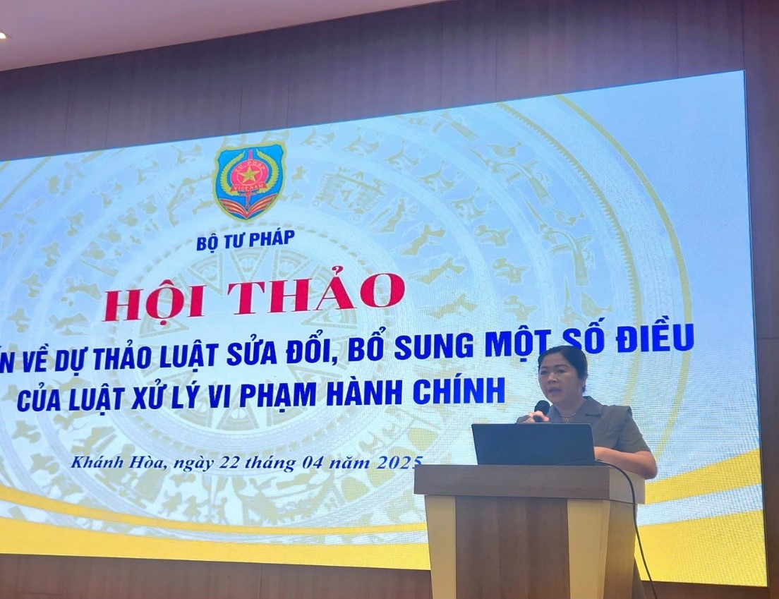 Sáng 22/4/2025, tại thành phố Nha Trang, Bộ Tư pháp tổ chức Hội thảo lấy ý kiến về dự thảo Luật sửa đổi, bổ sung một số điều của Luật Xử lý vi phạm hành chính. Bà Nguyễn Thanh Hà - Phó Cục trưởng Cục Kiểm tra văn bản và quản lý xử lý vi phạm hành chính - Bộ Tư pháp chủ trì Hội thảo.