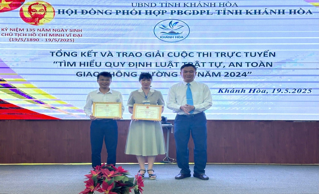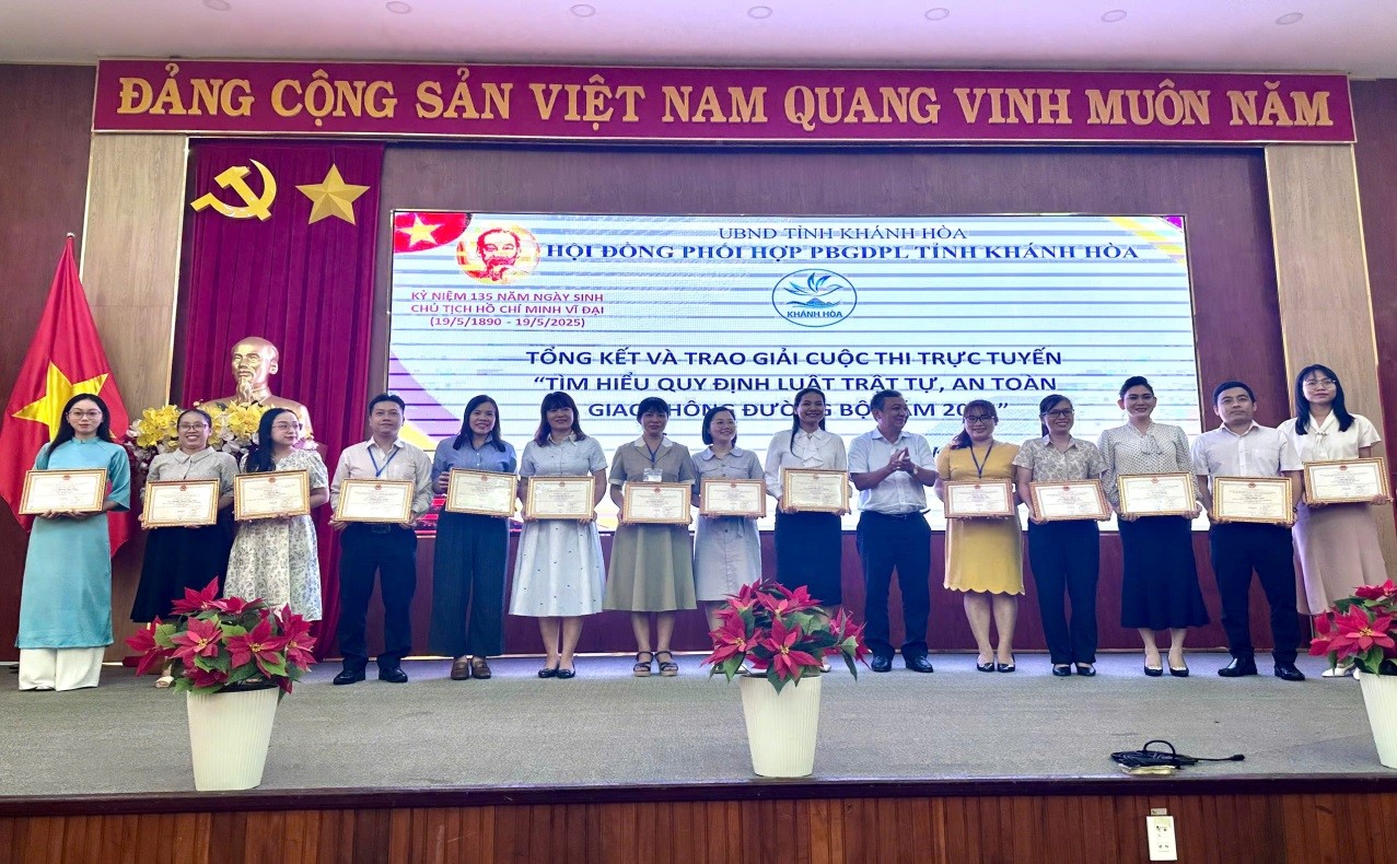 Hưởng ứng kỷ niệm 135 năm ngày sinh Chủ tịch Hồ Chí Minh (19/5/1890 - 19/5/2025), ngày 19/5/2025 Hội đồng phối hợp phổ biến, giáo dục pháp luật (HĐPH PBGDPL) tỉnh Khánh Hòa đã tổ chức Lễ tổng kết và trao giải cho các cá nhân và tập thể đạt giải Cuộc thi trực tuyến “Tìm hiểu quy định của Luật Trật tự, an toàn giao thông đường bộ năm 2024” trên địa bàn tỉnh Khánh Hòa, cuộc thi diễn ra từ ngày 15/4/2025 đến hết ngày 05/05/2025.