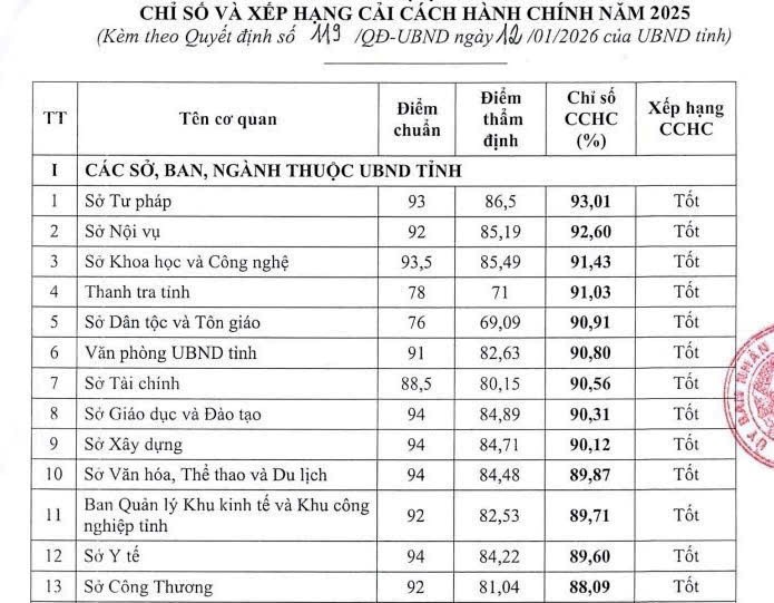Bên cạnh đó, chỉ số xếp hạng công tác cải cách hành chính được UBND tỉnh công bố tại Quyết định số 119/QĐ-UBND ngày 12/01/2026, Sở Tư pháp dẫn đầu trong khối các Sở, ban, ngành thuộc UBND tỉnh, với chỉ số PAR Index đạt 93,01%, tăng 02 bậc so với kết quả năm 2024.