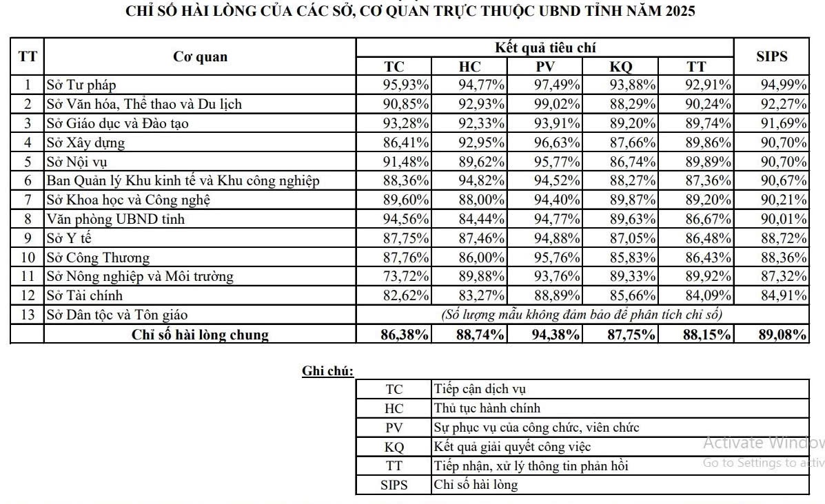 Theo kết quả đánh giá của tỉnh, Sở Tư pháp dẫn đầu toàn tỉnh về mức độ hài lòng của người dân, tổ chức đối với sự phục vụ của cơ quan hành chính nhà nước, được công bố tại Quyết định số 38/QĐ-UBND ngày 07/01/2026 của UBND tỉnh, với chỉ số SIPS đạt 94,99%, tăng 10 bậc so với kết quả năm 2024.