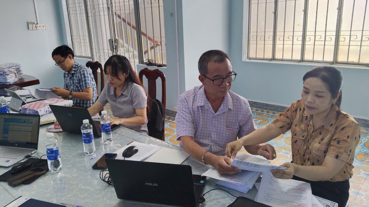 Ảnh: nhân viên Chi nhánh Văn phòng đăng ký đất đai Ninh Hòa (bìa phải) đang làm việc với Đoàn kiểm tra liên ngành của tỉnh
