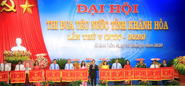 Ông Nguyễn Khắc Định - Ủy viên Trung ương Đảng, Bí thư Tỉnh ủy trao “Cờ thi đua của Chính phủ” cho các tập thể xuất sắc được tặng tại Đại hội thi đua yêu nước tỉnh Khánh Hòa lần thứ V.